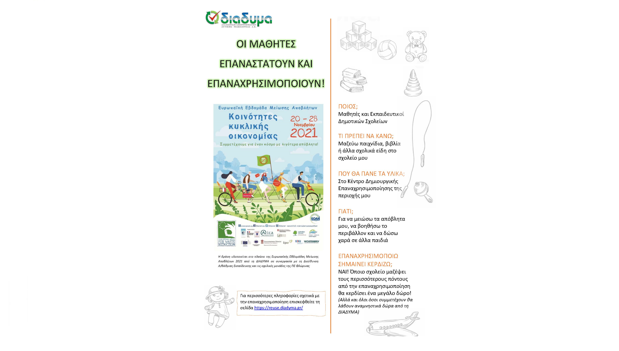 *Διευκρινίζεται ότι η ΔΙΑΔΥΜΑ διαθέτει σύστημα ανταπόδοσης των πολιτών και των σχολικών μονάδων που συμμετέχουν στην επαναχρησιμοποίηση μέσω των ΚΔΕΥ, εφόσον εγγραφούν στην πλατφόρμα επαναχρησιμοποίησης https://reuse.diadyma.gr/.
